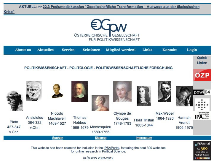 The Austrian Political Science Association (ÖGPW) was founded in 1971 and nowadays, with about 500 members, fosters research and knowledge exchange between the Austrian PS community and the international one. Along with conference and workshop organization, the association publishes its academic journal, the Österreichischen Zeitschrift für Politikwissenschaft (ÖZP), whose issues since 1996 are retrievable for free through an internal linking: abstracts, some full text and contributions’list are also available. The association has three sections, focused on democracy, political economy and comparative politics, as well as one dedicated to graduated and young scholars, each of them with a specific page in the website describing their initiatives, providing description of their projects and their meetings’programs as well as some publications (articles and books) retrievable full-text for free. The webpages of the ÖGPW are available in German only. The site is completely open and free and materials and info are retrievable by all users without any fee, but mostly they can be only saved on-screen. News, job and scholarship announcements, plus summers-schools and research grants are also frequently notified. A link list is available, pointing to external PS-related websources. The site structure is extremely simple and no navigational aid is needed to retrieve informations.